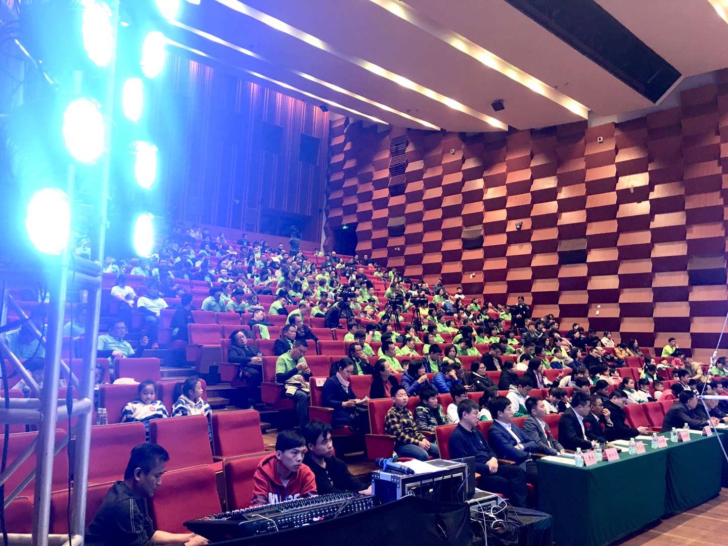 通常在舞臺(tái)后區(qū)做一面燈光墻,面向觀眾置于演員表演區(qū)后面。地面可以設(shè)置搖頭光束燈、大功率激光燈,以一定的仰角面向觀眾席后上方投射光束,也可用窄光束AC筒燈向舞臺(tái)兩側(cè)前方投射光束,并做跑燈變化。燈墻的燈具可以選擇窄光束LED投光換色燈向舞臺(tái)表演區(qū)正投,或使用窄光束LED投光換色燈在燈光墻里面向舞臺(tái)兩側(cè)投射,產(chǎn)生具有沖擊力的舞臺(tái)視覺(jué)效果。